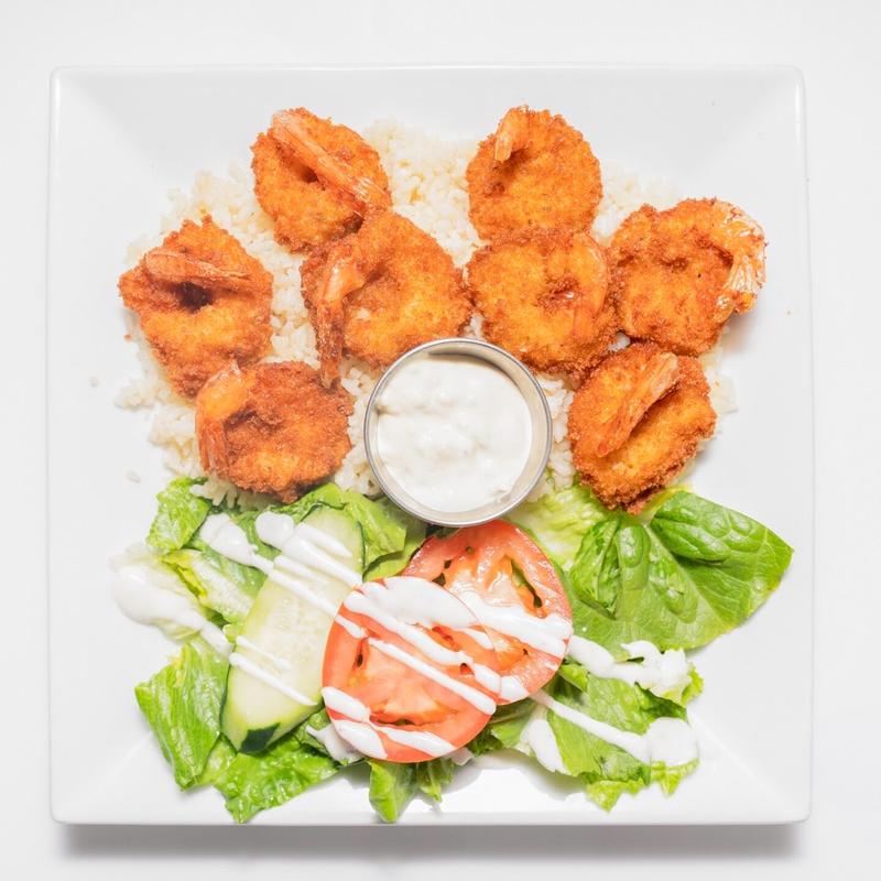 shrimp coated in breadcrumbs and deep fried. served with rice, salad and tartar sauce