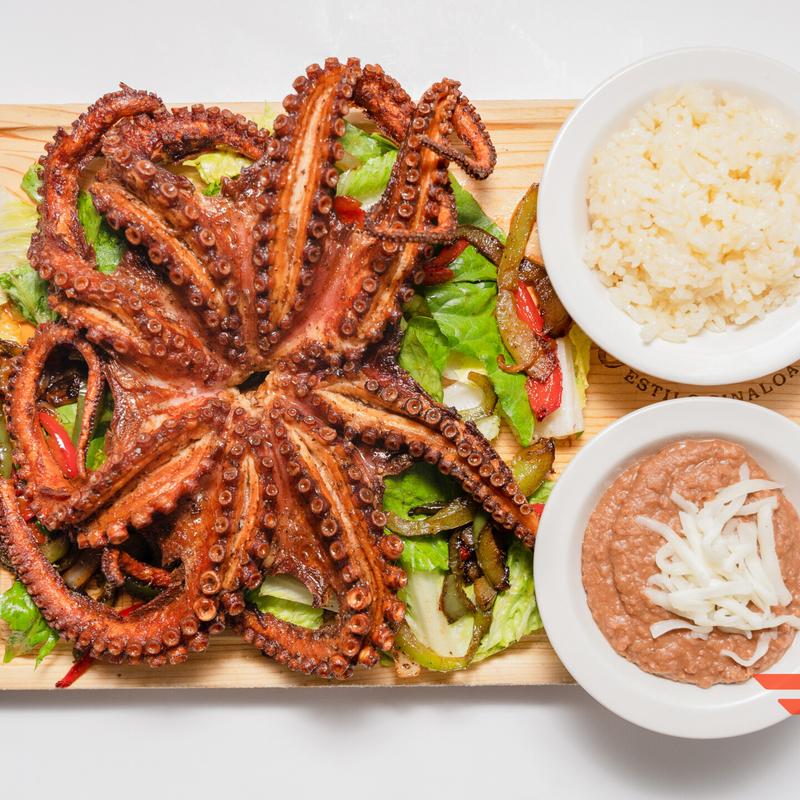 Aguachile with cooked octopus. Choice of black, red, green, or mango sauce
