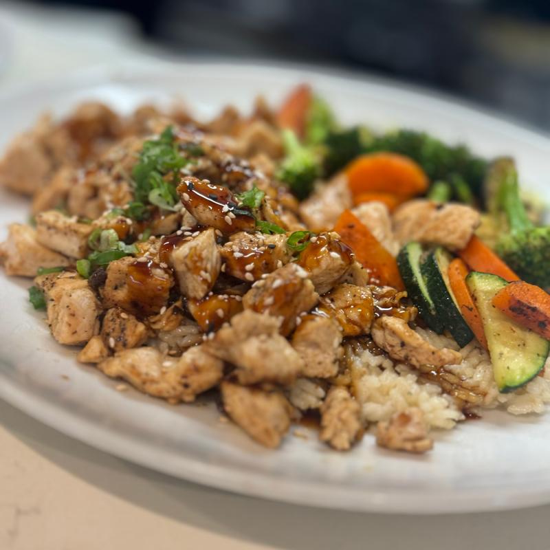 chicken teriyaki, sauteed veggies (broccoli carrots, zucchini, green onions) house rice; topped with teriyaki sauce.