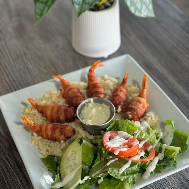 stuffed shrimp with cream cheese and bell peppers wrapped in bacon. served with rice and salad